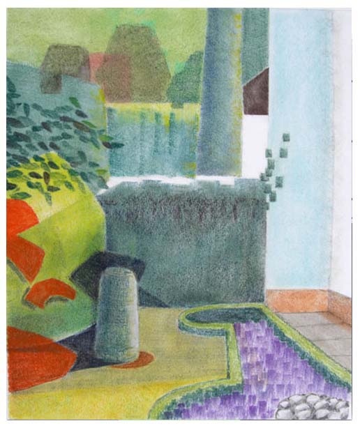 Eine verfremdete Darstellung meines hinteren Gartenbereichs. Zahlreiche Skizzen habe ich von diesem, meinem Lieblingsplatz.